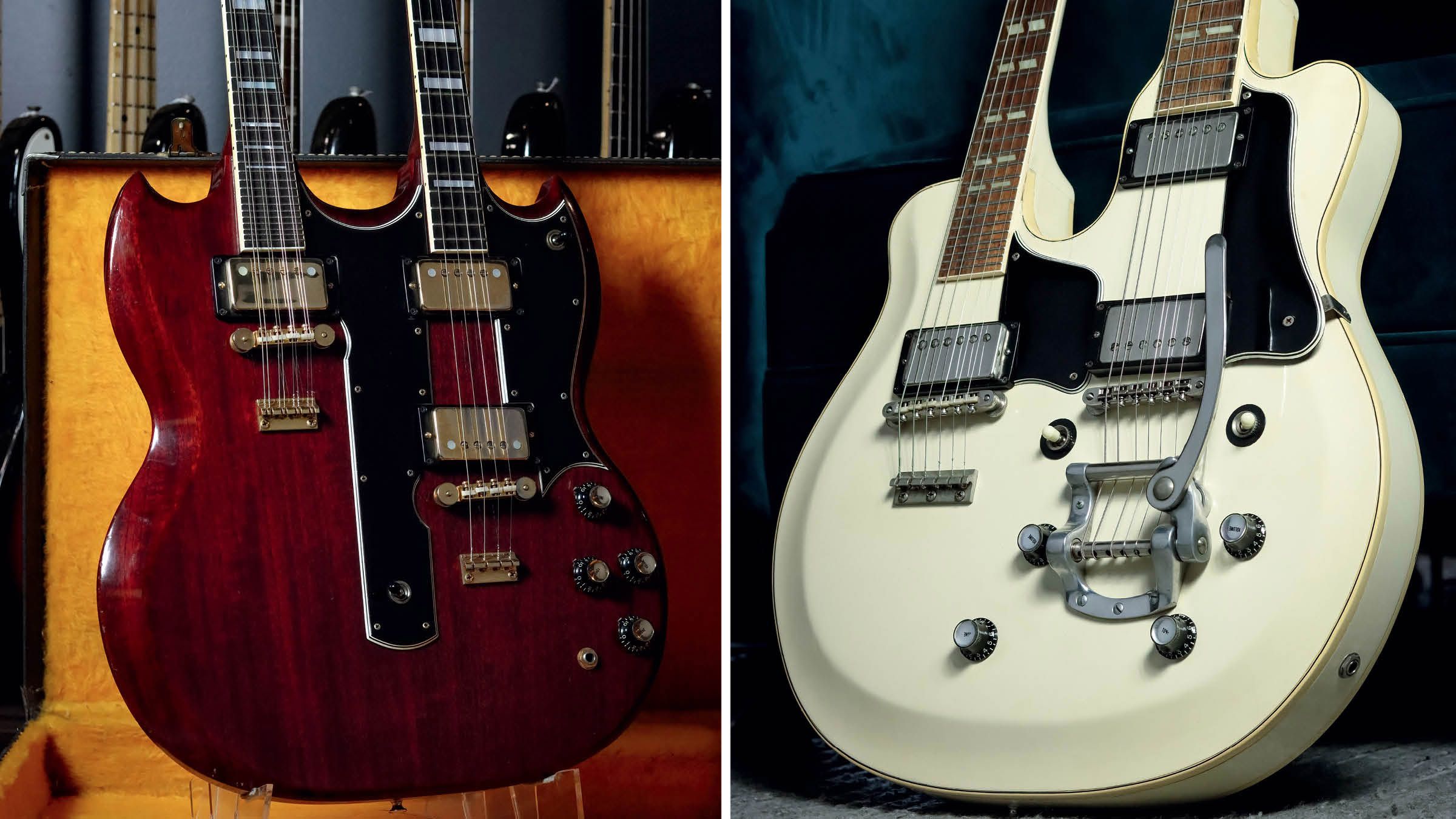 The Polaris White one is a 1961 EMS-1235 with a regular six-string neck and an octave six-string neck, and its most interesting and unusual feature is the Bigsby on the octave side. Gibson made these with Venetian and Florentine cutaways, but this one is …