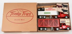 Youngsters of the post-WWII era, not unlike children of today, especially loved toy sets that were authentically detailed and came with lots of imagination-stirring accessories. A 1956 Tonka #B-206 Trailer Fleet Set certainly filled the bill with its Cargo King Truck and Trailer (manufactured in 1956 only), Livestock Truck and Trailer, Log Trailer with logs, and animal figures. The example offered by Milestone was all original in its 25-inch-long partitioned box with insert. Graded Excellent, it attracted multiple bidders who drove the final price to $5,520 against an estimate of $1,500-$2,500.